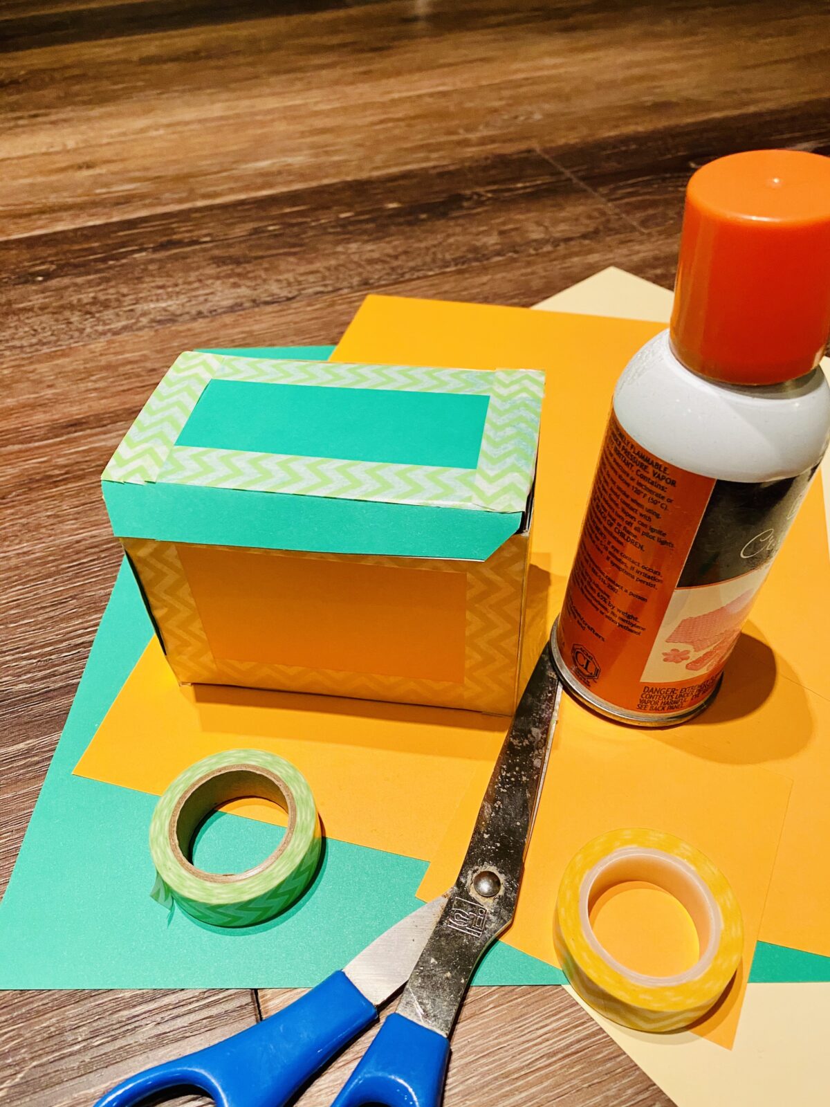 So, one easy way to do this is to glue on some craft paper to the outside sides of the box. And feel free to alternate colors.
